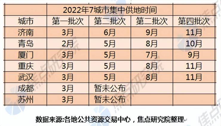 青岛、武汉、厦门、重庆和济南等7个城市已明确全年供地计划分四批次供地,其余城市依旧延续2021年实行的一年三次土地供应的土地供应节奏。