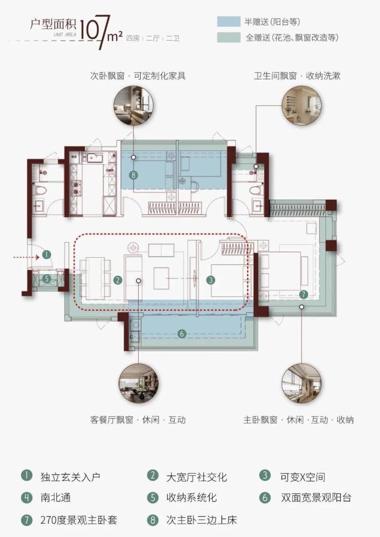 4.5开间朝南提升舒适度。全天候自然通风设计。中心化餐厅+灵活X空间,拓展生活场景。270度观景主卧套诠释精致生活,套房化设计强化舒适感。
