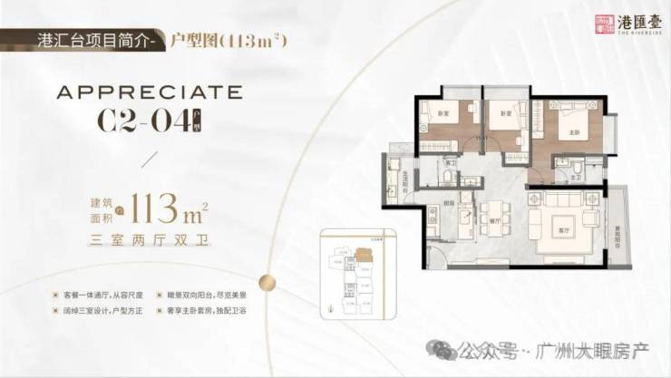113㎡三房两厅两卫,阔绰三室设计,户型方正,釆光面广,瞰景双向阳台,尽览美景,奢享主卧套房,独配卫浴