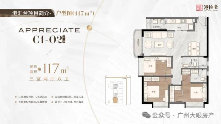 117㎡三房两厅两卫,阳台飘台视野广,无界风光,主卧奢配衣帽间,私藏优雅双阳台向阳,美景釆光入室,客卫三分离设计,井井有序