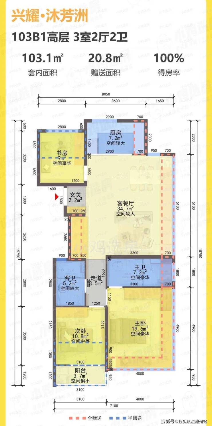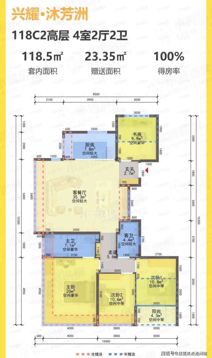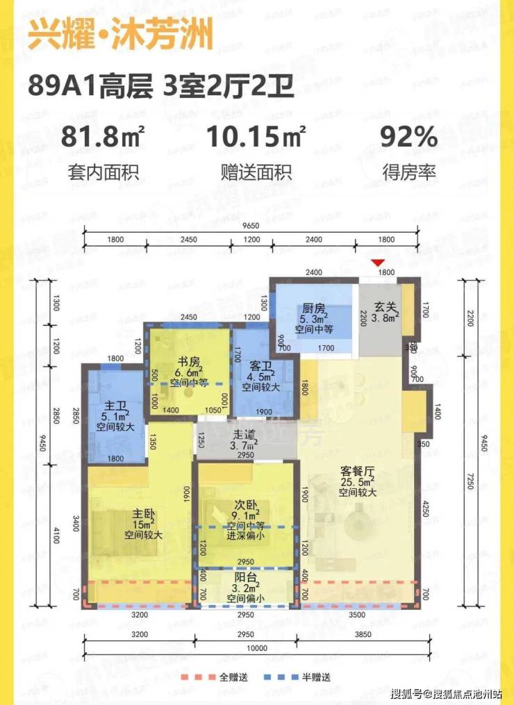 以一般项目得房率平均90%来算,兴耀沐芳洲约100%的得房率,同样百平米户型,兴耀沐芳洲比其它项目多出10个平方,相当于一间卧室;要是换算成房款,直接省下25-30万!相当于花同样的钱,买更大的空间,性价比直接拉到顶!
