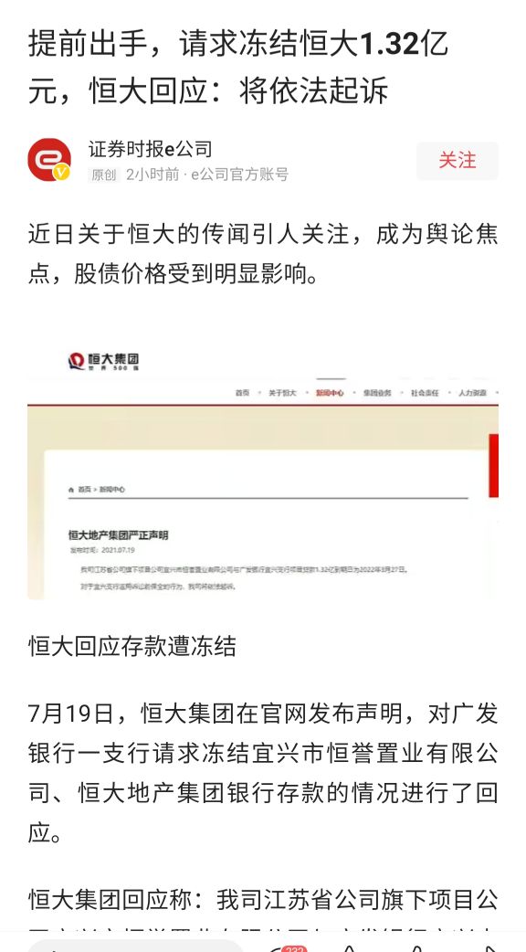 恒大随后发布《严正声明》表示:“我司江苏省公司旗下项目公司宜兴市恒誉置业有限公司与广发银行宜兴支行项目贷款1.32亿到期日为2022年3月27日。对于宜兴支行滥用诉讼前保全的行为,我司将依法起诉。”