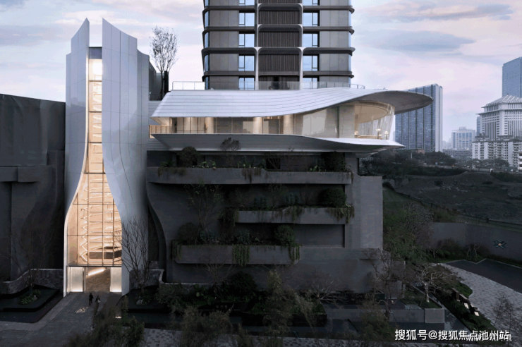 观宸一期AB地块在30米台地之上,于是这里有了一组颇具科幻感的建筑地标,近30米高的重楼,以及如同宇宙飞船一般悬停于30米台地之上的云所;