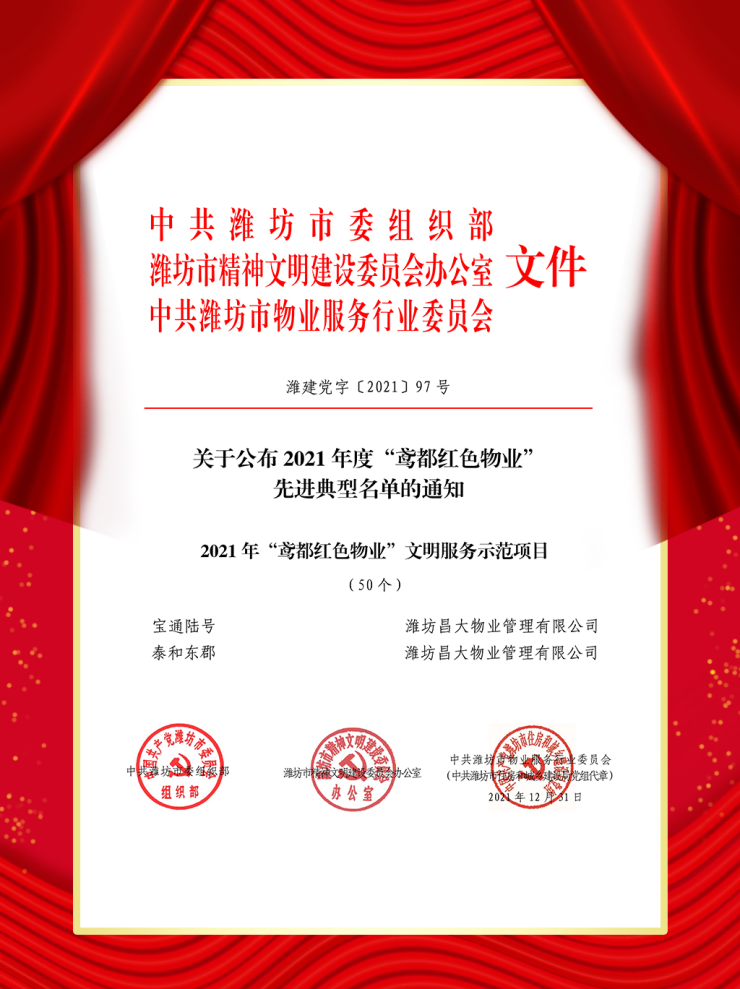 日前,由潍坊昌大物业管理公司提供服务的宝通陆号、泰和东郡小区物业项目,被中共潍坊市委组织部、潍坊市精神文明建设委员会办公室和中共潍坊市物业服务行业委员会三部门联合确定为2021年度“鸢都红色物业”文明服务示范项目,获得了各级领导的高度认可与市民的衷心赞扬。可想,若非经过无数个日夜的坚守与改进,又怎会收获如今的喜悦,而这离不开服务团队中每一份力量的支持。