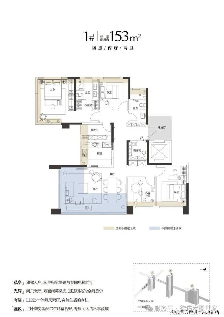 该户型为1号楼16-28层西边户,在153户型基础上增加了西侧家政间和北侧卫生间等面积,高区和低区做成了不一样户型。主卧做到了三面全景落地窗,客厅也有西南向270度的景观视野。该户型是本项目的王炸户型,即可以保证采光,也有不错的江景,但有西晒影响。