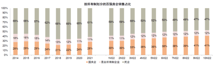 图表13:10M22央国企在百强房企销售金额占比从往年不足30%提升至40%以上