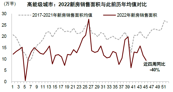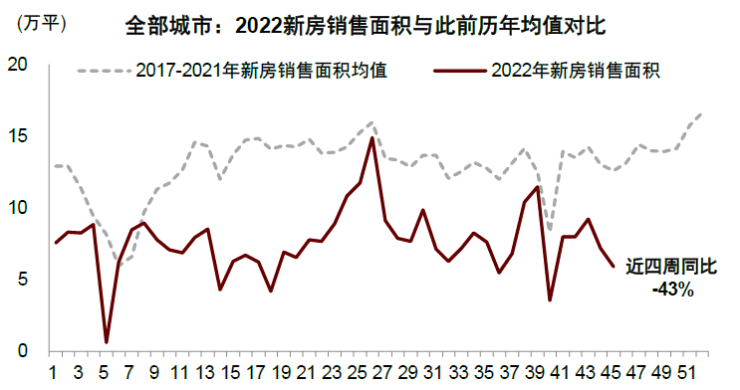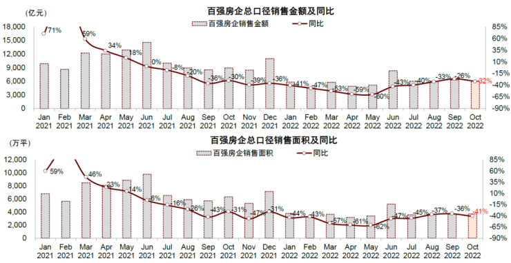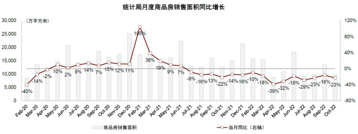 图表5:2021年7月商品房销售面积同比转负,2022年10月同比跌幅仍在-23%