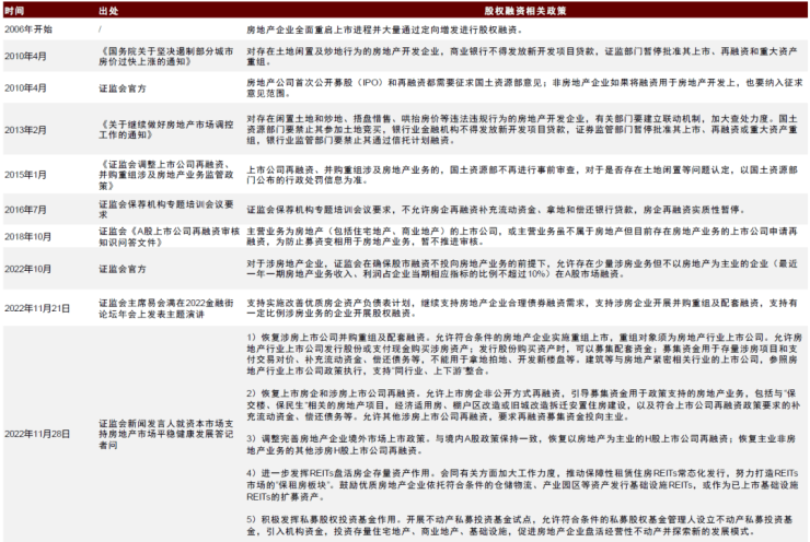政策积极推进对财务受困企业的债务、资产重组及收并购事项,引导募集资金用于“保交楼”项目及经适房、棚改等保障性住房项目的建设,亦规定发行股份购买资产募资资金不能用于拿地拍地、开发新楼盘等用途。我们认为本次政策调整目的在于充分发挥资本市场的功能,以改善优质房企资产负债表,盘活存量住宅、商业、基础设施等多种资产,对于降低房企杠杆有积极作用。短期看,我们认为政策有助于扭转房地产市场下行风险,并稳定地产行业对宏观经济大盘的支撑;中长期看,有利于构建多层次的房地产融资体系,促进房地产行业与企业新发展模式的形成与房地产市场平稳健康发展。