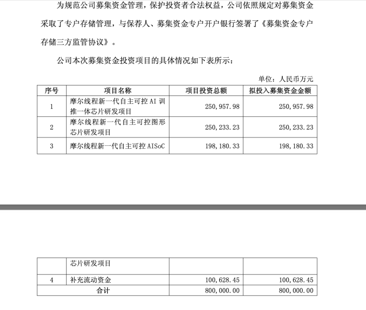 而据此前披露的资金使用计划,摩尔线程募资的80亿元,将用于摩尔线程新一代自主可控 AI 训推一体芯片研发项目、摩尔线程新一代自主可控图形芯片研发项目、摩尔线程新一代自主可控AI SoC 芯片研发项目及补充流动资金。