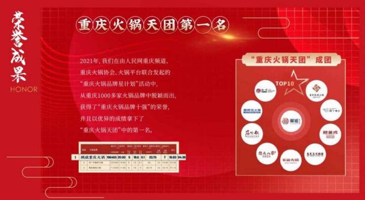 作为重庆老火锅的城市名片,珮姐重庆火锅获得:中国火锅品牌十强、重庆火锅天团第一名、重庆|北京|深圳|上海|杭州五城的火锅热门榜第一,重庆|深圳|杭州三城的美食&火锅双榜第一,等多个荣誉。