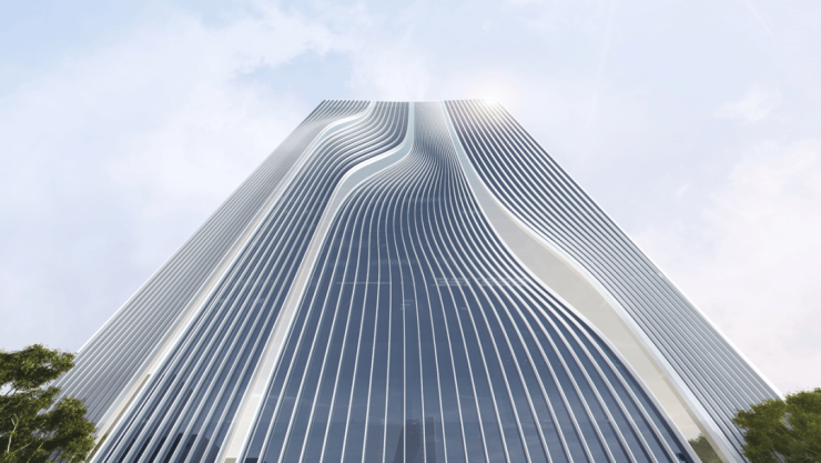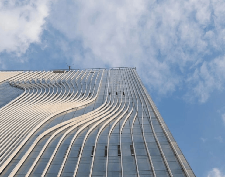 四栋塔楼组成了粤胜广场,每栋建筑高度均为 150 米,虽然4栋的建筑高度都一样,但是整体造型并不是刻板不变的,形态在统一中寻求变化!建筑的立面线条非常流畅,就好像行云流水一样,立面上的曲线像珠江上的波痕。