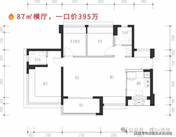 约86㎡(横厅)3房2卫:总价374万