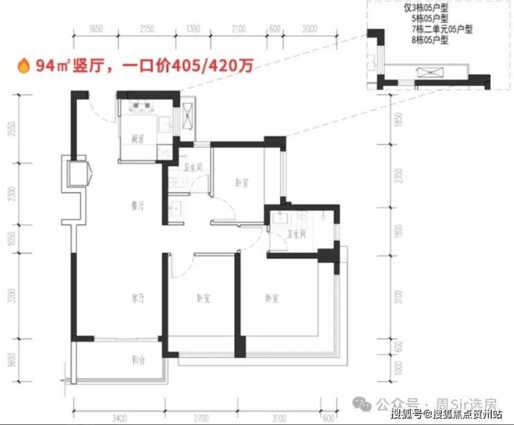 约94㎡3房2卫:总价405/420万