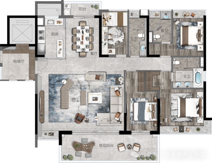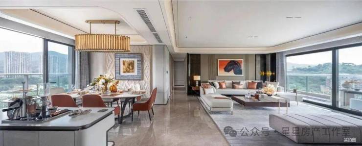 183㎡四房两厅三卫:约 8.3 米宽景阳台设计,可享受 270° 环幕视野,双主卧套房设计,起居更加从容,还带有大方厅、中西厨岛台设计,空间尺度奢阔。