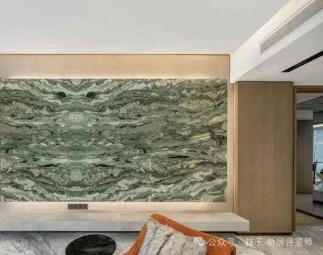 意大利卡拉拉原矿的多款大理石,奢侈地漫铺于地面和墙面上,公区背景墙则采用巴西进口石材天宝石,纹理与色泽好似青绿山水,质地却温润如玉,正是观云钱塘城的同款。