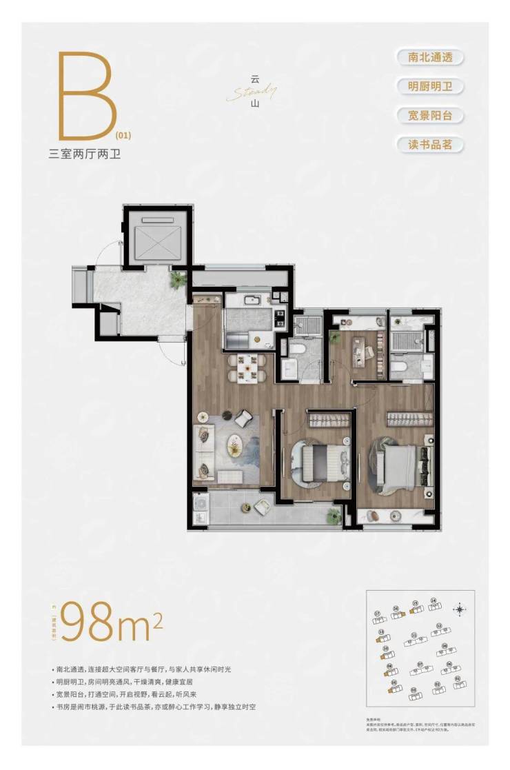 约98㎡3房2卫户型,三开间朝南,并且这贯穿客厅+次卧的超大阳台实在是惹眼,这个南向的视野延展度以及采光度相比同级别的户型来说,要更加出色。