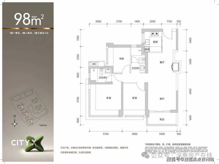 98㎡的3房2卫,折后总价376-417万/套,折后单价3.79-4.21万/㎡。