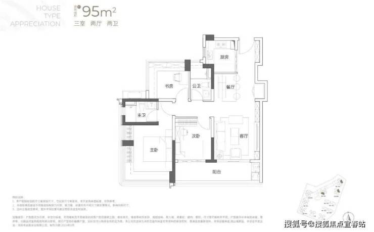 95㎡的3房2厅2卫设计的是竖厅格局,客厅3.5米开间,LDKB一体化,S墙设计预留冰箱卡槽位,3个卧室分别做到了3.6米/2.8米/2.8米的宽度,主卧加1个次卧270°全景飘窗,客厅连接次卧出6.3米长的大阳台,U型厨房,得房率约85-95%(包含赠送),西南或东北朝向。