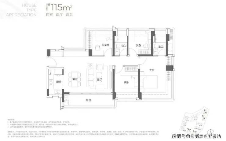 115㎡的4房2厅2卫设计的是横厅南北通透格局,客餐厅6米开间,LDKB一体化,全屋飘窗,4个卧室分别做到了3.9米/3米/2.8米/2.6米的宽度,主卧加1个次卧270°全景飘窗,客厅出6米长的大阳台,L型厨房,得房率约85-95%(包含赠送),西南或东南朝向。