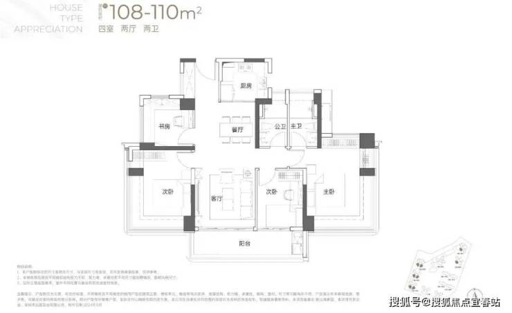 108-110㎡的4房2厅2卫设计的是竖厅双龙抱珠格局,客厅3.5米开间,LDKB一体化,4个卧室分别做到了3.7米/3.4米/2.8米/2.6米的宽度,主卧加2个次卧270°全景飘窗,客厅连接次卧出6.1米长的大阳台,U型厨房,得房率约85-95%(包含赠送),西南或东南朝向。