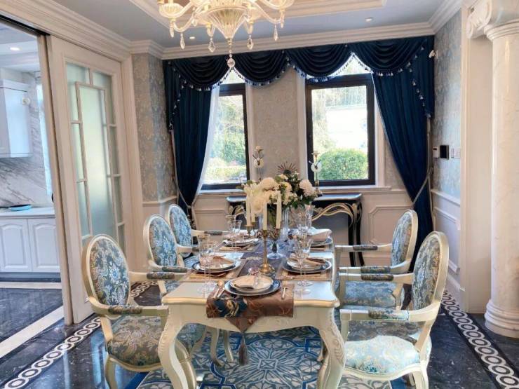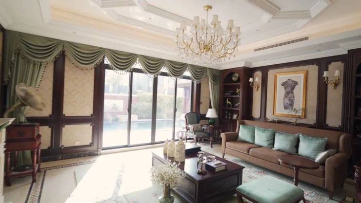 约6.3米挑空的客厅里,水晶吊灯垂下来像一朵绽放的花,阳光透过270°全景飘窗洒在地板上,映得墙上的油画格外 的美好。
