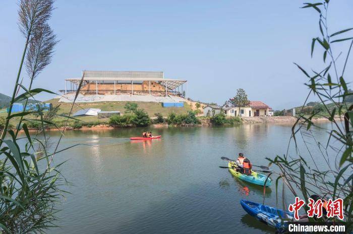 游客在浙江安吉古城考古遗址公园里打卡皮划艇 江成城 摄