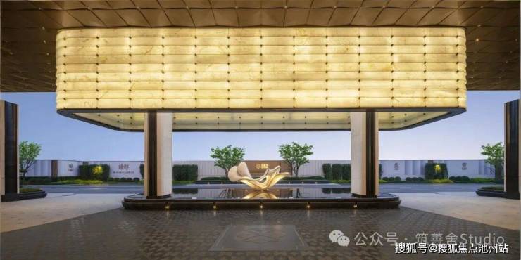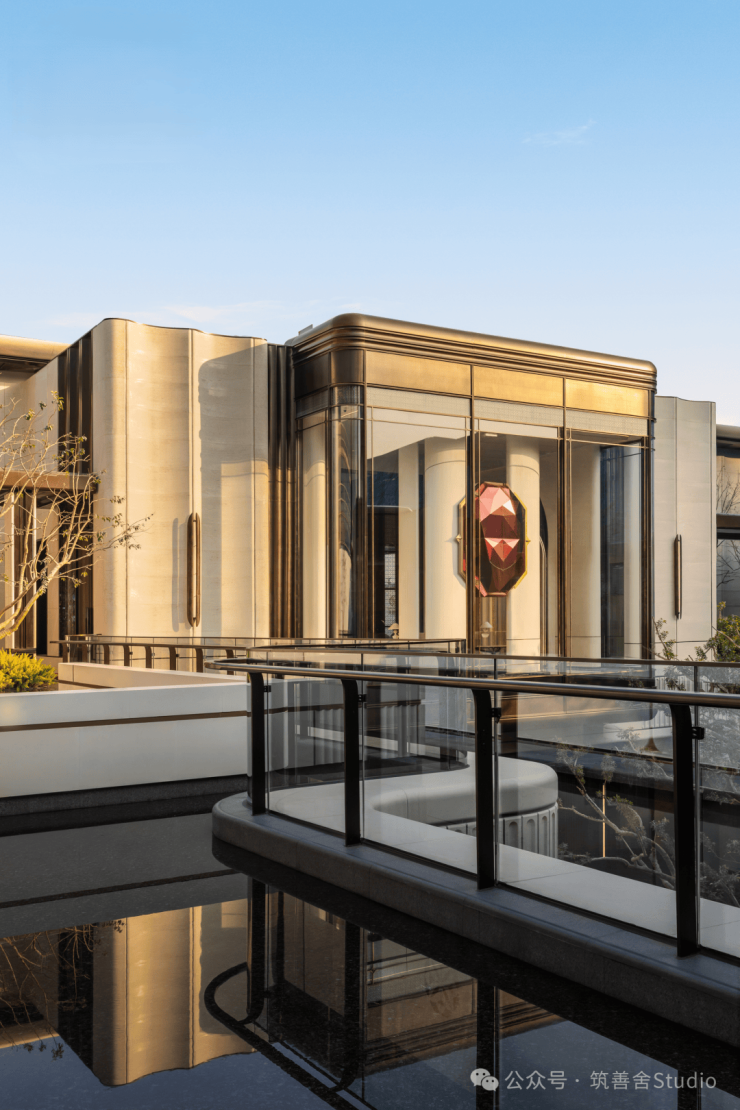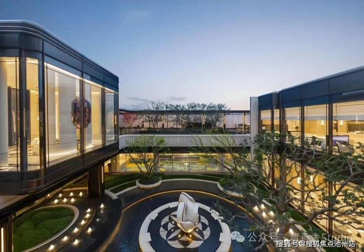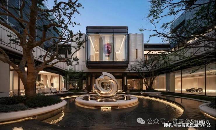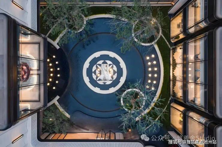 下沉式庭院以“泗水归堂”的围合设计,巧妙汇聚四方之水,寓意“聚财纳福”。晴日水光流金,雨天波光洒银,景致变幻万千。庭院四周百年老树与乌桕成荫,绿意盎然。中央“瓯曜门庭”主题雕塑,演绎“水绕玉环,漪生珮响”的意境,形藏风聚气。池底奢石采用幻影蓝,与巴黎丽兹酒店同款的蓝钻奢石相映成辉,皆为自然孤品。地形还原“错落水景”等自然地貌,呈现“水光晃动,曲水流觞”的立体动态美感,视觉震撼。