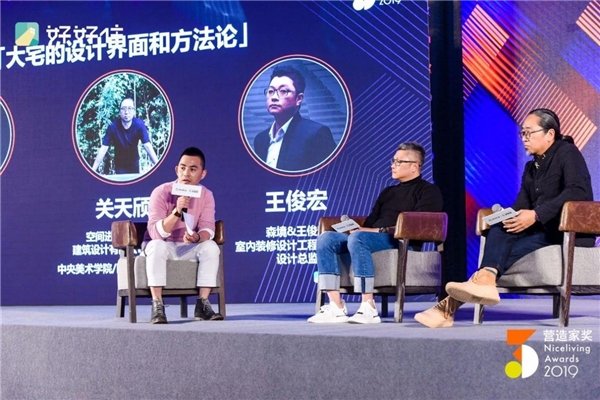 上图为2019「营造家奖」颁奖现场,评审方磊、王俊宏、关天颀分享大宅设计经验。