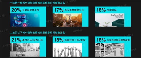 上图为「好好住家居研究院」出品的《2019中国城市家庭居住报告》内容截图,数据分布显示在一线及新一线城市中,53%的消费者从线上渠道获取家装/家居信息。