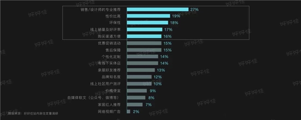 上图为「好好住家居研究院」出品的《2019中国城市家庭居住报告》内容截图,数据分布显示销售/设计师的专业推荐成为影响家居产品成交的首要因素。