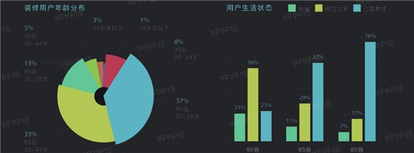 上图为「好好住家居研究院」出品的《2019中国城市家庭居住报告》内容截图,数据分布显示目前装修的主力军多集中在85、90后。