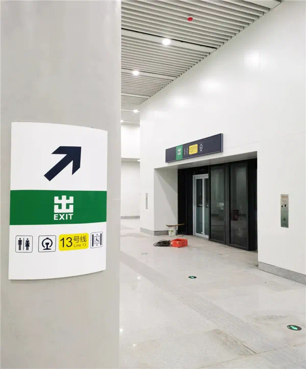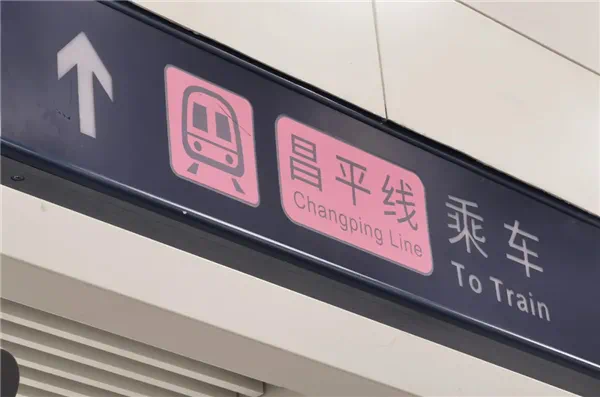 各类指示标识已基本安装完成,粉红色调的昌平线标识十分醒目。