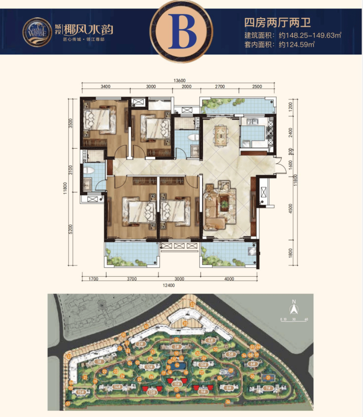 B户型:建面约148.25-149.63㎡四房两厅两卫