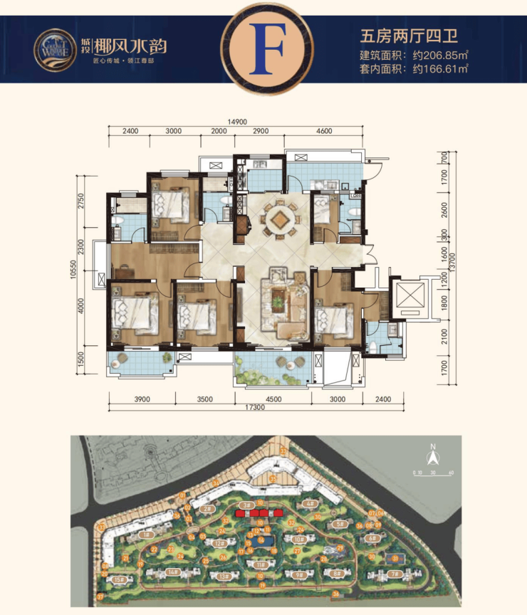 F户型:建面约206.85㎡五房两厅四卫