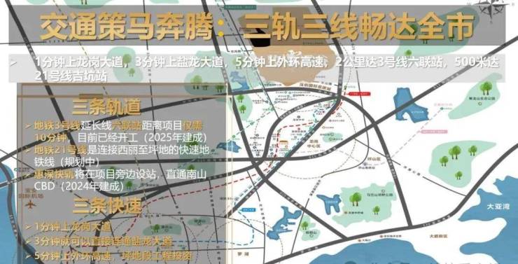 双地铁+深牌车自由,通勤焦虑终结者,项目距离深圳地铁3号线延长线六联站(建设中,预计2025年通车)直线距离约2km,地铁21号线(规划中)、深惠城轨惠州段(规划中)。更让粤B车主心动的是小区去龙岗中心车车程30分钟——小区车位配比1:1.2,且不受限行约束,早晚高峰往返深圳畅通无阻。