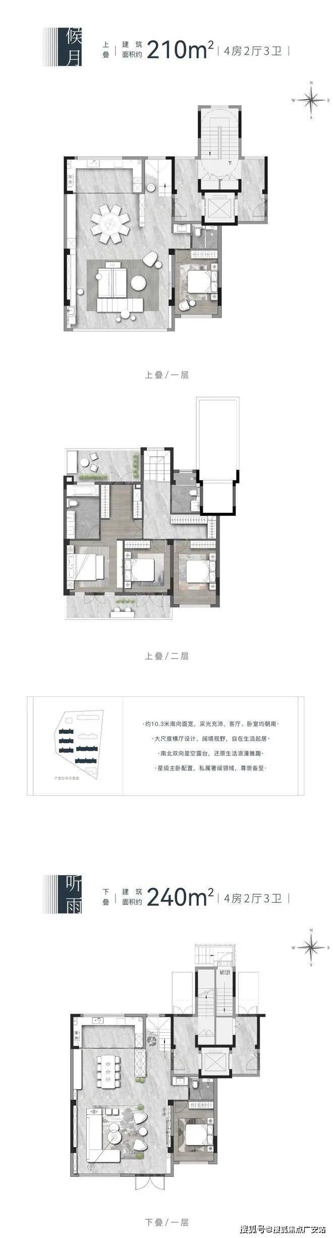 按照项目规划,云栖雅集拟建 8栋住宅,带来建筑面积约140-256㎡户型。从鸟瞰图可以看到,项目采取高低配的模式,有 叠加、大平层、小高层三种产品。
