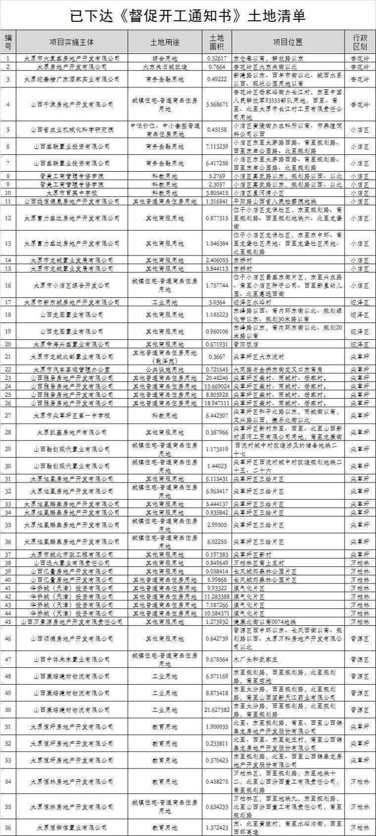 9月9日,据太原市规自局公开信息,该局经调查核实后发现,有部分土地未按合同约定进行开工建设。该局于今年6月以来,向恒大、富力、华侨城等41家涉及未按期开工项目的企业签发了《督促开发通知书》,对其共计56宗未按期开工的土地进行了督促,要求其尽快开工建设,并下达了《督促开工通知书》土地清单。