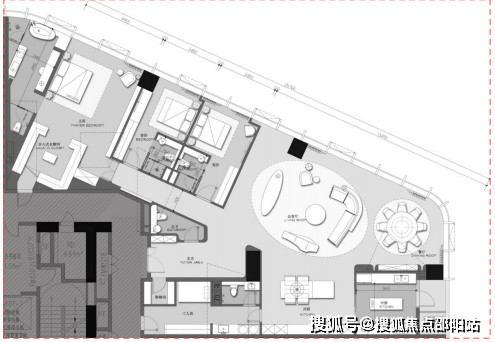 建筑面积约 439㎡,为 3 + 1 房 2 厅 2 厨 5 卫布局。该户型由 LSD 亲自操刀设计,拥有 270°城市与绿化景观,高区可看海景。采用全套房、双主卧设计,客餐厅开间超 10 米,方正主卧面积达 24㎡且为明卫设计,次卧带阳台,中西厨结合,还有多功能房,空间灵活多变。