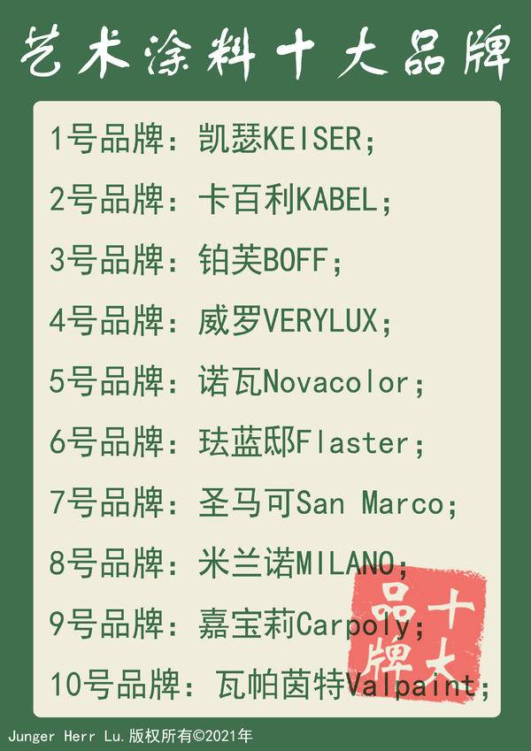㊀ 凯瑟KEISER; ㊁ 卡百利KABEL; ㊂ 铂芙BOFF; ㊃ 威罗VERYLUX; ㊄ 诺瓦Novacolor; ㊅ 珐蓝邸Flaster; ㊆ 圣马可San Marco; ㊇ 米兰诺MILANO; ㊈ 嘉宝莉Carpoly; ㊉ 瓦帕茵特Valpaint; 2021年