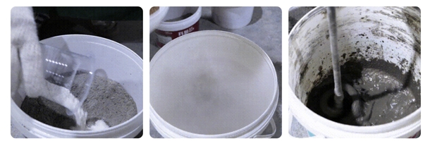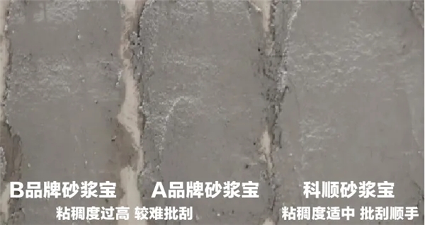 科顺家庭防水-砂浆宝与其他品牌砂浆宝分组按参考比例搅拌混合,对比混合后砂浆的粘稠性跟批刮性。