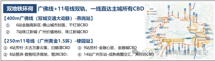 1、双地铁上盖:距广州首条黄金环城线11号线棣园站约250m,“换乘之王”广佛线燕岗站约400m,0换乘直达珠金琶,轻松链接全城,虹吸广佛优质资源。