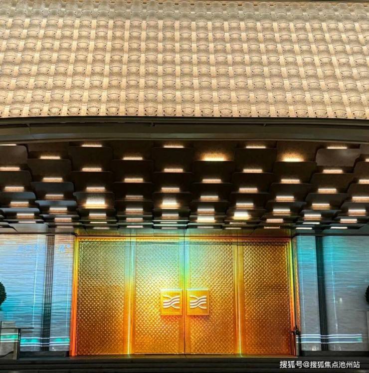 你看社区大门宽约46米,高约9米,灵感源自“京杭大运河博物馆”设计,顶部大约2280块水晶瓦精心雕琢,内部超300块金鳞铝板手工拼接,还有层叠水景,整个一看就贵气。