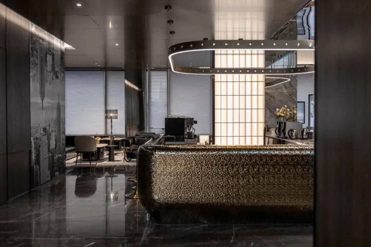 作为杭州最早的大型居住区之一,在首层入户大厅公区,以钛金板+背景墙石材+木格栅的组合,延续着宝格丽一贯富有格调的装修风格。唐忠汉先生非常倡导场域中心论,他通过LDK一体化设计新趋势,让整个开放空间形成了室内的场域中心,尽享景观视野的同时,也就是社交空间。