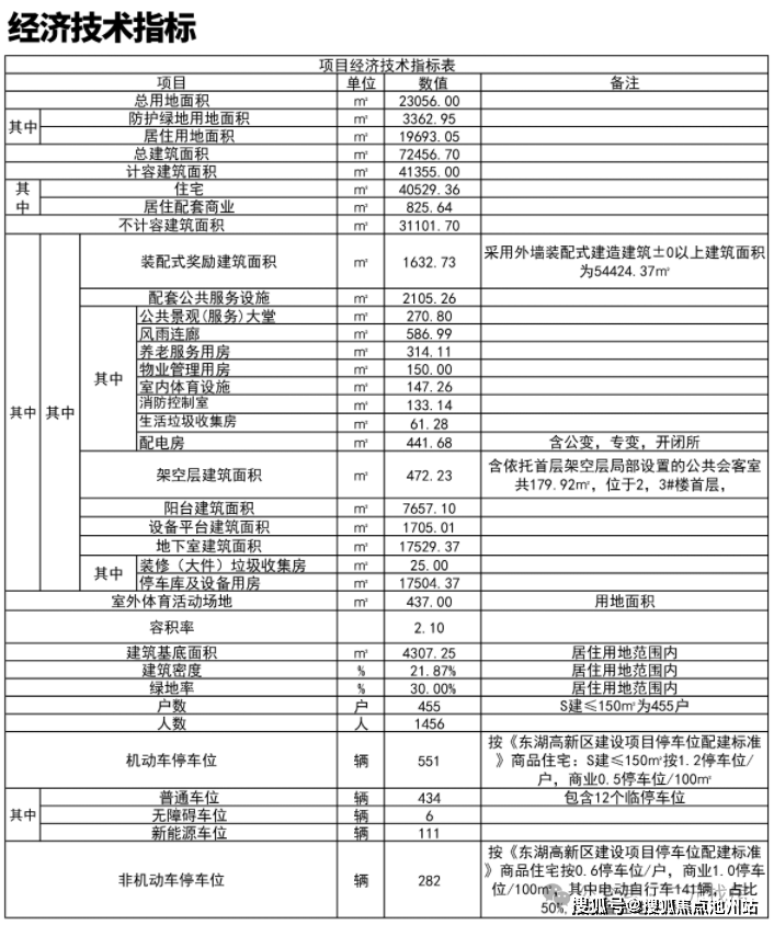 根据规划,项目的总建筑面积约72456.7㎡,计容建筑面积约41355㎡,住宅建筑面积约40529.36㎡,容积率2.1,总户数455户,户均89.07㎡,机动车位551个,车位比约1:1.21。