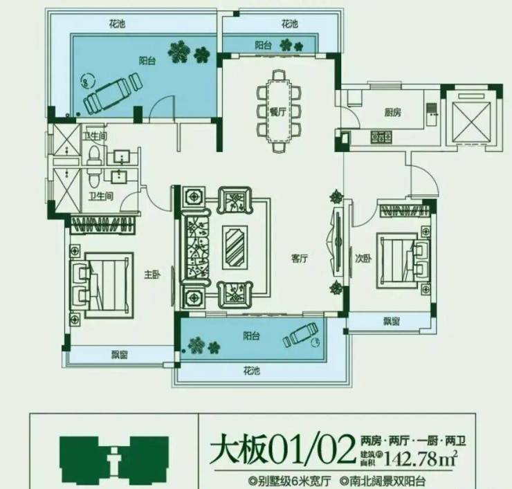建面约143㎡,2房2厅1厨2卫