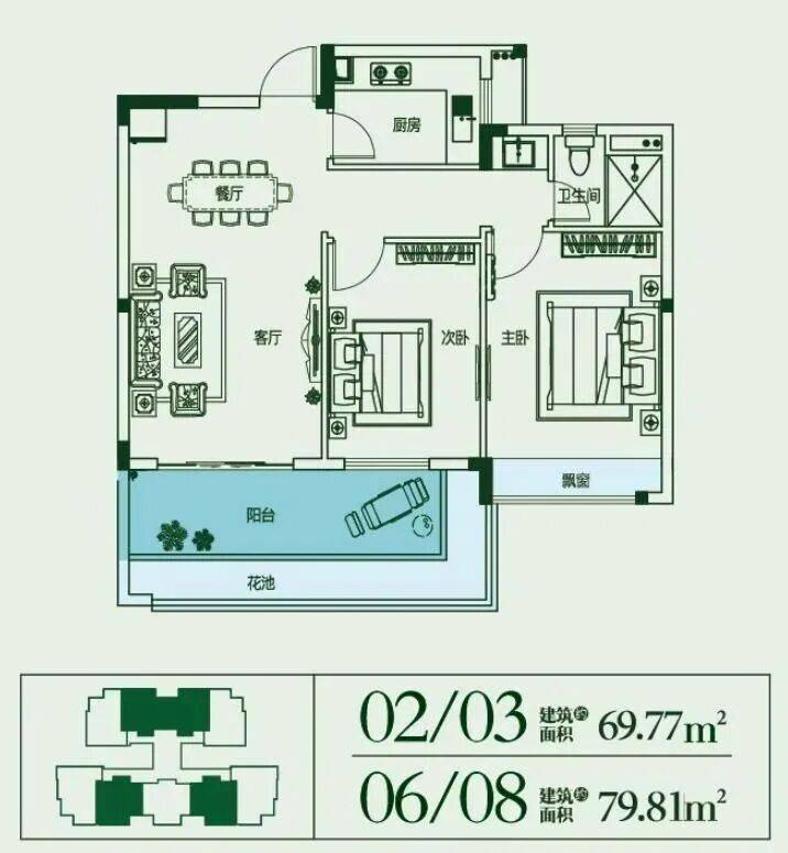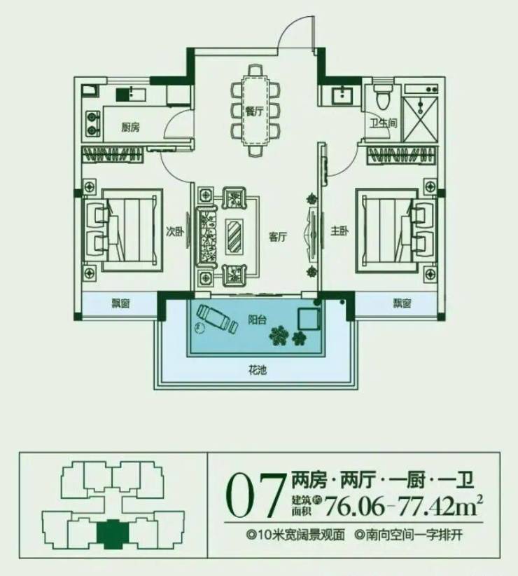 建面约70~80㎡,2房2厅1厨1卫