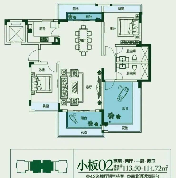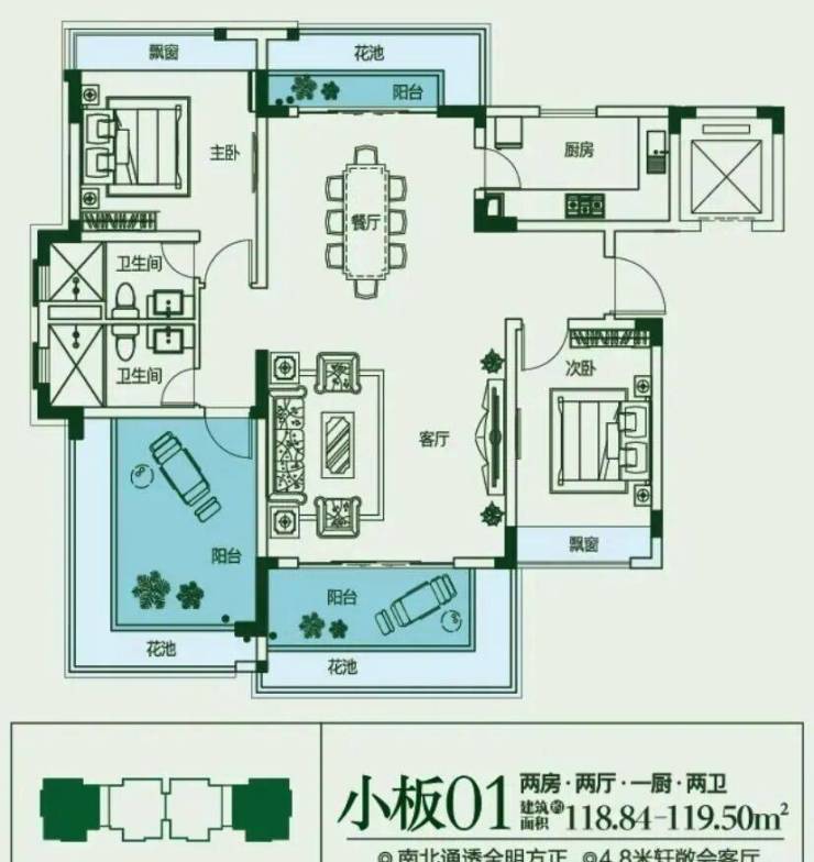 建面约118㎡,2房2厅1厨2卫