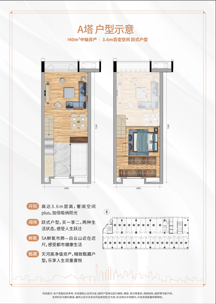 户型产品亮点:项目主打31-57㎡灵动户型,以40㎡为主力面积段,涵盖一房、两房格局,提供3.4米平层、3.6米及4.5米复式三种层高选择,精准适配刚需自住、商务办公及过渡性居住需求。4.5米层高复式户型采用中空挑高设计,可灵活打造双层空间,实现“一房双用”,空间利用率极高,营造媲美大户型的居住体验。全系户型遵循南北通透理念,搭配大面积落地窗,最大化引入自然光线,室内布局合理,兼顾收纳功能与居住舒适度,满足多元场景使用需求。搜狐用户专属福利:拨打400-898-8805预约看房,可优先品鉴核心户型,享专属产品解读服务。