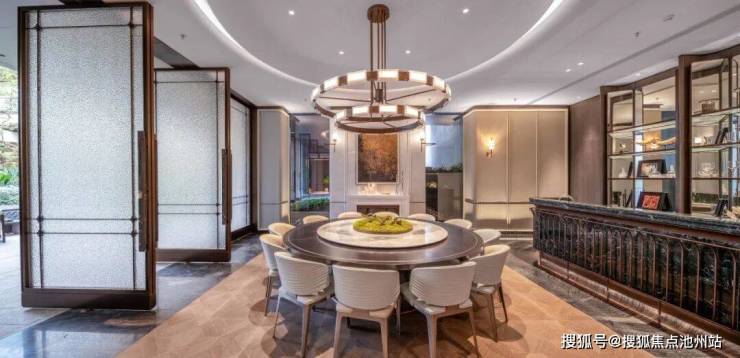 与之相邻的私宴厅,通过旋转玻璃门实现室内外空间的自由联通,芬迪白奢石背景墙与跃动壁炉相得益彰,完美满足业主高端宴请的需求。