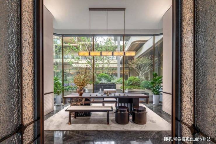 温润的尼克石墙面,与落地窗外的园林相映成趣,水纹玻璃屏风营造出朦胧雅致的光影效果;天然奢石吧台与上方的层叠透光石吊架,共同构筑了一处兼具艺术性与功能性的社交场。